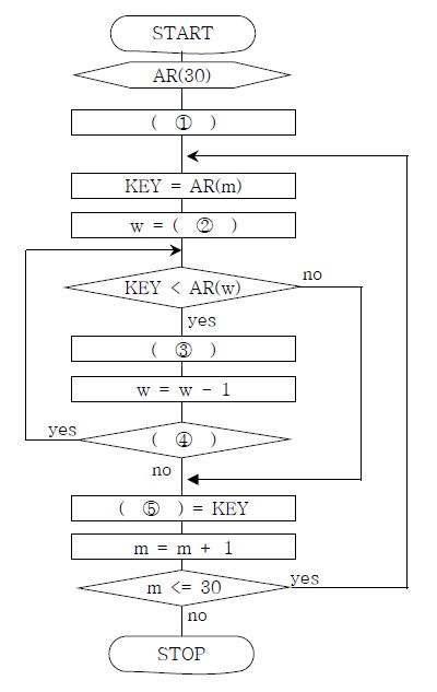 제시된 순서도는 100보다 작은 30개의 자연수가 배열 AR(30)에 정렬되지 않은 상태로 저장되어 있을 때 이 데이터를 오름차순으로 정렬하는 삽입정렬 알고리즘을 나타낸 것이다.